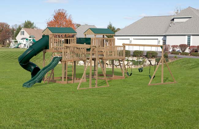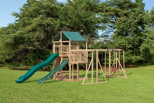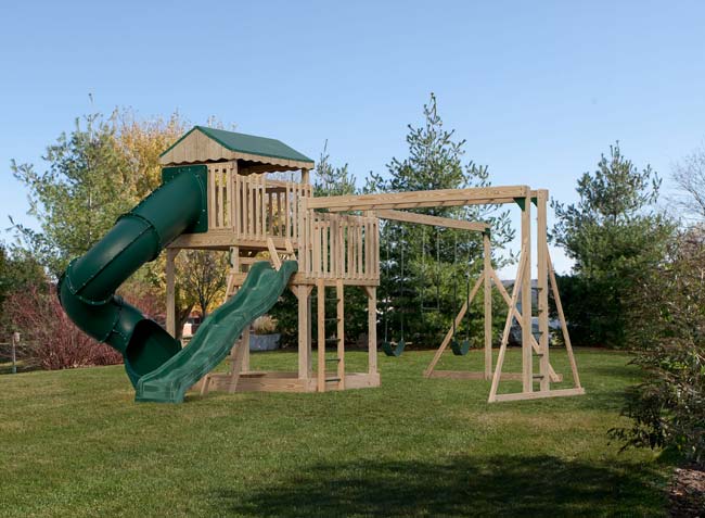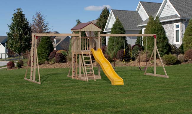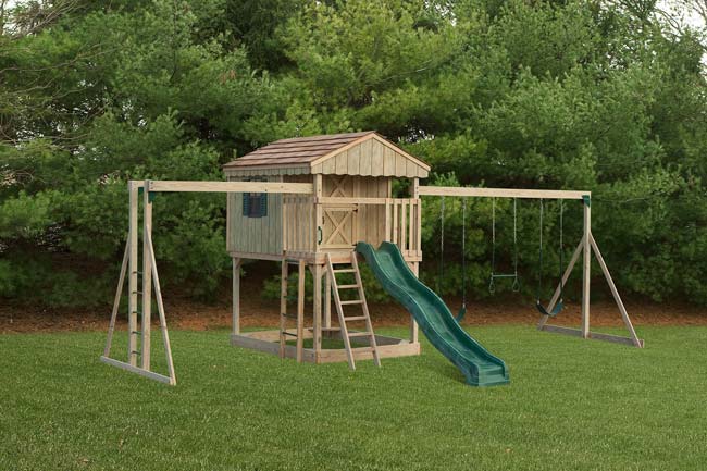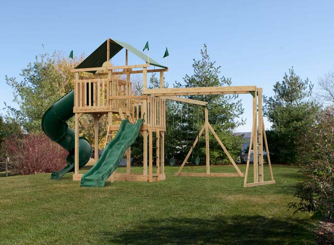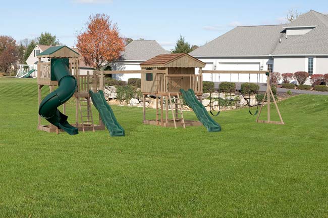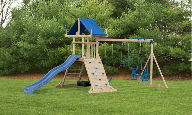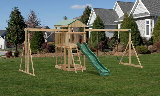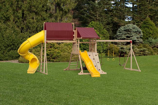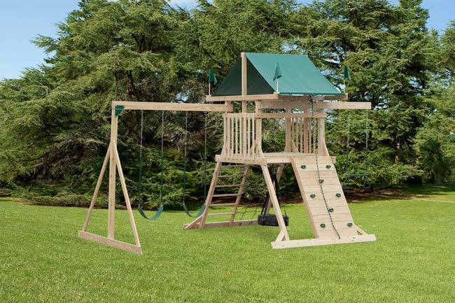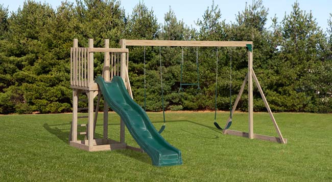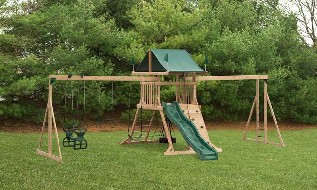 Remember being push on the swing and then learning how to pump so nobody would have to push you or how about seeing who could go the highest and jumping off the swing. What a great feeling! You and your family and friends could spend hours playing on your swing set. Your imagination was the limit. Thinking back on those memories bring a smile to everyone. Now it’s time to for your children or grandchildren to make memories of their own. We offer a large selection of American made swing sets one is sure to meet your needs.